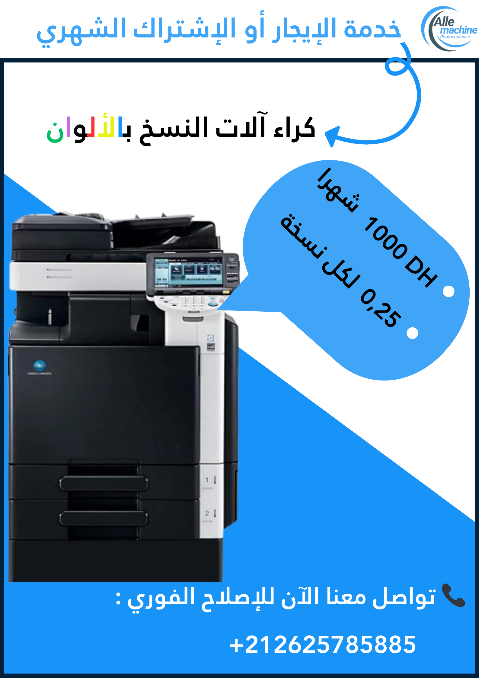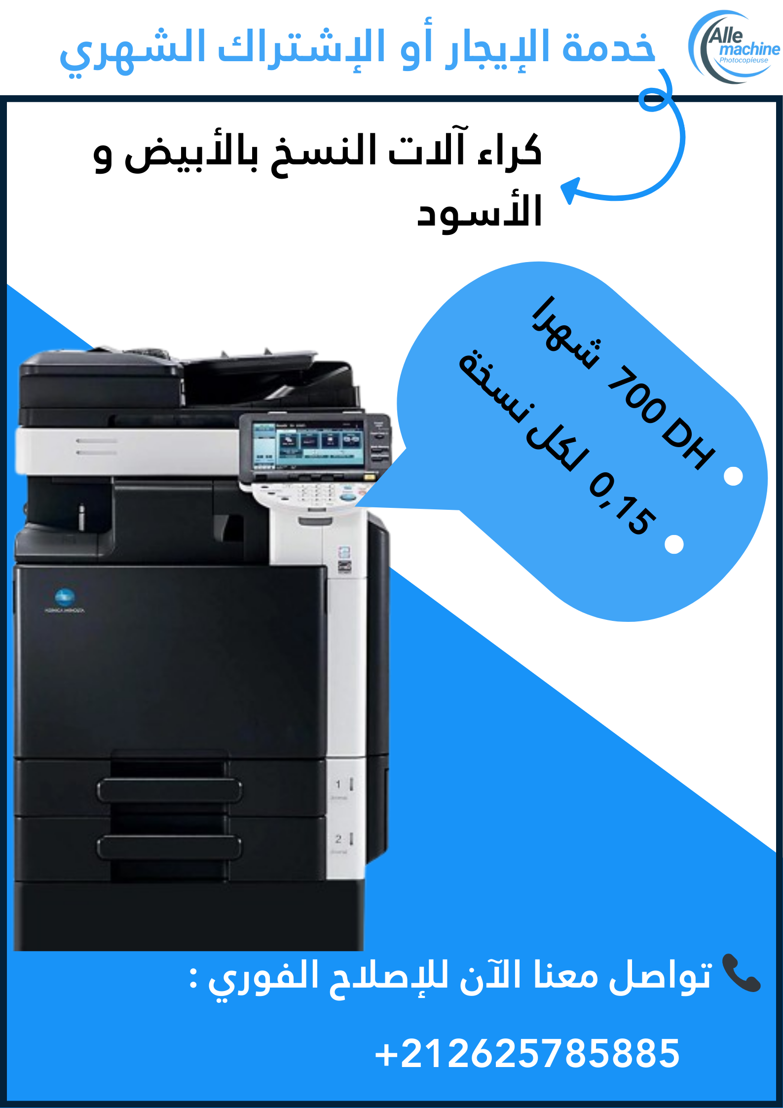 🔹 خدمة كراء آلات النسخ التي نقدمها تمنحك راحة البال، لأنك تستفيد من آلة احترافية بأداء عالي، مقابل اشتراك شهري مناسب، دون الحاجة لشراء جهاز جديد أو دفع تكاليف صيانة مفاجئة.